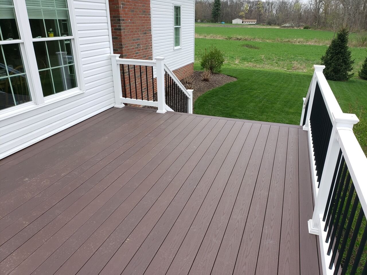 The clients called Northfield, OH, deck builder Archadeck of Akron to replace their faded deck with color-fast composite decking they can trust. Our brand selection for this project was AZEK, a company with the best fade-and-stain warranties in the industry. Loving the rich colors of the Harvest collection, the homeowners chose the Kona color.