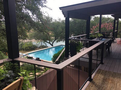 When you have a house this big, overlooking a large swimming pool AND the Colorado River, not just any deck will do. You need a very special deck, a one-of-a-kind deck for this one-of-a-kind Texas Hill Country home situated between Lago Vista and Marble Falls, TX. Archadeck of Austin was the right company to design and build this splendid deck with four pergolas.