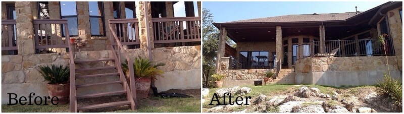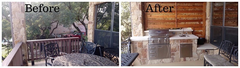 These Austin-area homeowners may not have realized, when they ordered an outdoor kitchen, that they would also be getting a side order of fantastic views! Sometimes one thing leads to another … Archadeck of Austin could see right away that their old, bulky cedar railings were blocking much of the view of the valley and the Colorado River below.