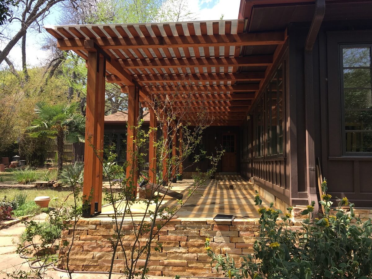That’s what these Austin homeowners requested when they called Archadeck of Austin about their old pergola. The homeowners, retired professors living in the neighborhood adjacent to University of Texas, wanted someone to rebuild and improve the pergola structure they dearly loved, but was finally at the end of it’s life. Great care had been taken the first time it was constructed with small little details that had significance to them. The structure covered a flagstone patio area and was more a bridge from the garden to the home rather than a shade structure- it was a major architectural feature. The challenge – “keep the basic design but improve on the details”