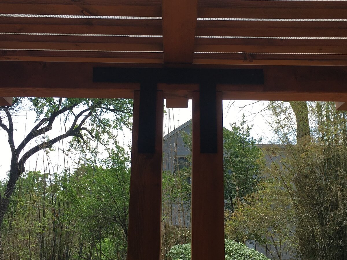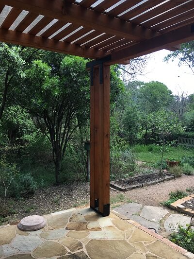Archadeck of Austin accepted the challenge. . Our attention to detail and woodworking skills served us well on this project. We custom-designed iron post bases to support and elevate double posts spaced such that the rafter sat right between the posts. Metal braces were used to provide lateral bracing, avoiding angular braces. All the metal was powder coated to avoid any chance of rust, scratching and wearing. We decided to use 2×4 slats laid flat with more than normal spacing to simplify the lines, and all the wood was Douglas fir, chosen for the beauty and tightness of the grain. All the edges were smoothed over with a router bit, to eliminate sharp edges.