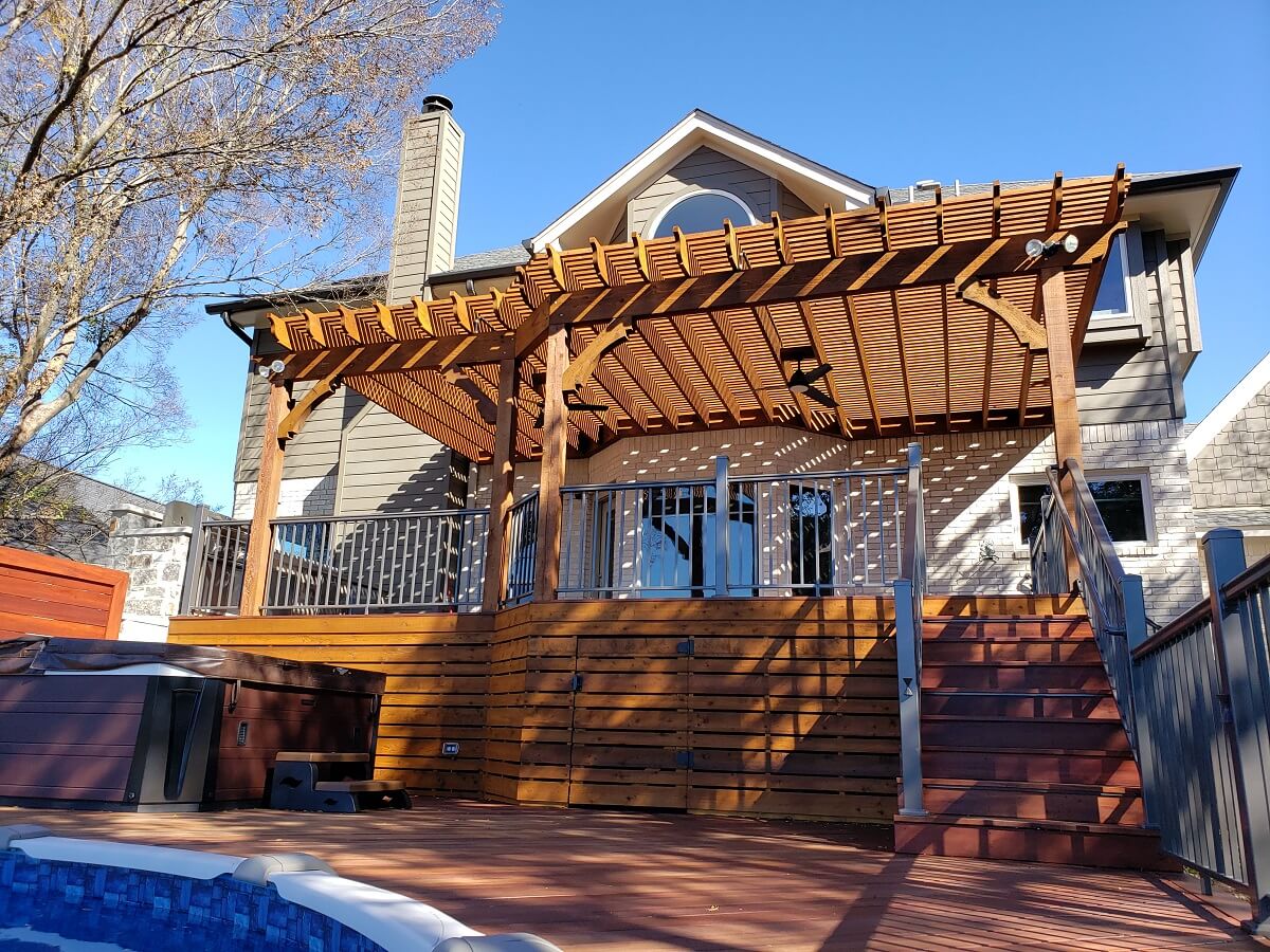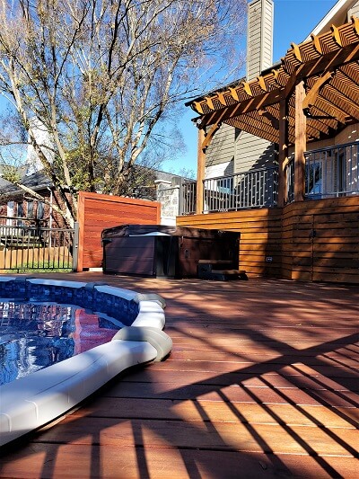 For their multi-level deck, the homeowners chose tigerwood, one of the exotic hardwood decking options. It’s hard to beat the beauty and durability of tigerwood. We also used tigerwood for the privacy screen behind the hot tub.