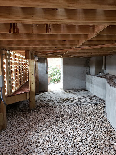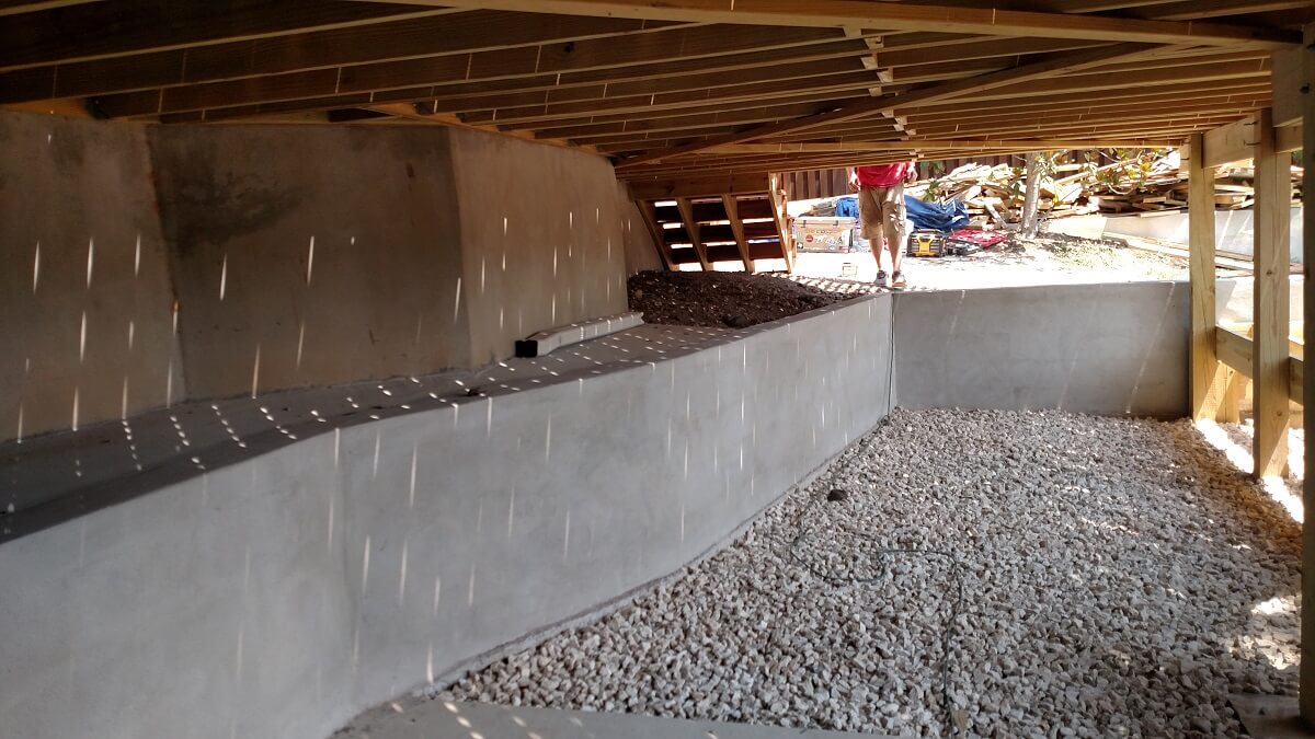 Under the pool deck we installed double joists to accommodate the weight of the hot tub. We built a huge storage area under the deck, large enough to walk into – about 8 feet high. We finished off the storage area with 2-inch gravel to ensure proper drainage and avoid wash out. The service panel for the hot tub is under the deck, and we installed lighting there to provide visibility when service is required.