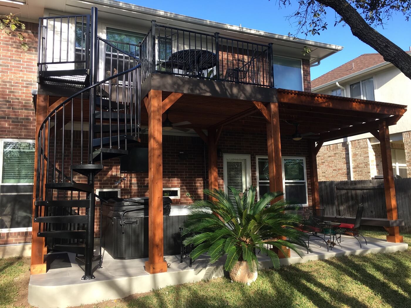 The design incorporated something you don’t usually see outdoors … a spiral staircase, which was specifically requested by the homeowner. We were able to locate a spiral staircase kit that wasn’t too expensive and still delivered the quality we needed for this project. Overall this design is an example of packing a LOT of outdoor living into a relatively small space. The deck features low-maintenance composite decking by AZEK and a black metal railing by Fortress. You can read more about this project in our story Spiral staircase is a winner for this just-right Steiner Ranch combo deck-patio-pergola affair