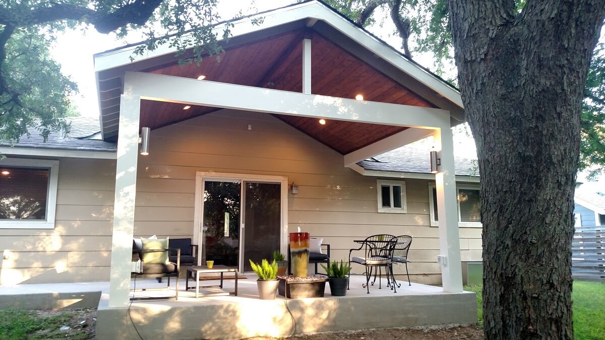 If you look closely, you can see that the roof of the new porch cover starts at a higher point than the edge of the original roofline. When this home was built, an 8’ wall height was standard. We designed the addition of this porch cover to give the home a more modern look. We pocketed the beam that supports the porch roof into the wall of the house, so the beam is sitting on top of the actual top plate of the wall. The offset system ties into the house farther back on the roof. With this design, we were able to bring the porch cover up one foot higher than the home’s walls and add depth to the footprint of the home.