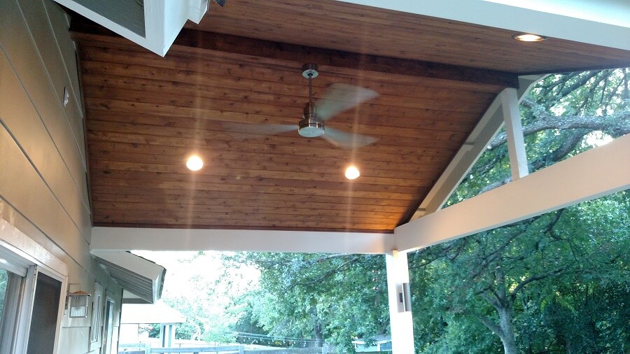 The homeowner liked the exposed rafter and tongue-and-groove construction of the old soffit, so they asked that we keep that open rafter look with the new porch cover. We were able to do that. We used Hardie soffit and fascia materials and used tongue-and-groove cedar on the interior of the soffit. We constructed the ceiling of the porch cover with matching tongue-and-groove natural cedar, and we shingled the porch roof to match the home’s roof. We painted the new fascia to match the beams and posts of the porch cover.