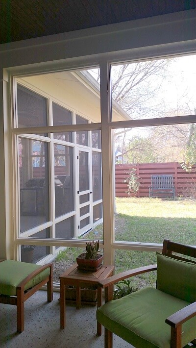 Instead of purchasing prefabricated screen panels, we custom built everything in this North Central Austin screened room project. While we appreciate some of the short-cuts of today’s building methods, at Archadeck of Austin we prefer to install screens for a screened porch the old-fashioned way. Some builders use a tuck and roll method of installing screens, but we have observed that screens installed this way are inclined to stretch and sag. Instead, we use the blind stop method. For this we attach wood trim to each side jamb of the frame. The trim (also called an outside stop or blind stop) defines the outer edge for the screen. After we insert the screens, we install another piece of trim, this one called an inside stop. This method produces a stronger screen panel and keeps the screens taut. We also use a higher quality, heavier screen than many builders use for screened porches.