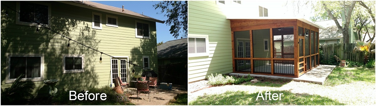 What do you do when your South Austin, TX, back yard is full of mosquitoes and you have no outdoor living structures except a small concrete slab out back? This is not a hard question, is it? You trade that little concrete slab for a reasonable-size screened porch, right? Yes!