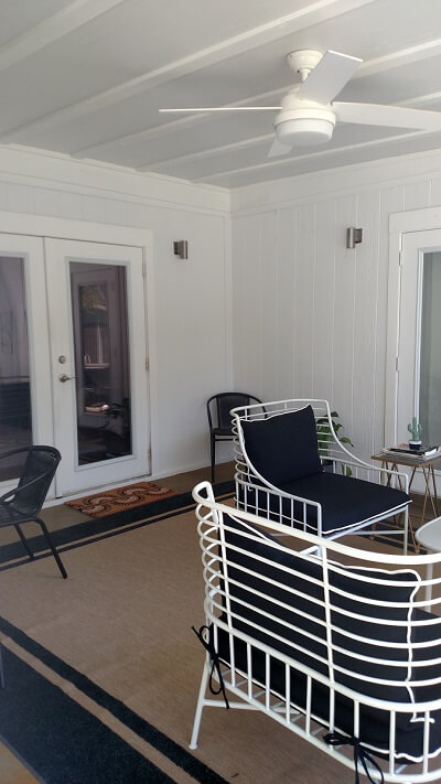 On the interior of the porch, we primed the walls and installed the screens to make it a screened-in porch. We added 1×4” trimmers of wood along the ceiling to soften the aluminum roof and to hide the seams of the patio cover installation. It turned out great! The trimmers running the length of the porch ceiling make the porch feel longer than it is.