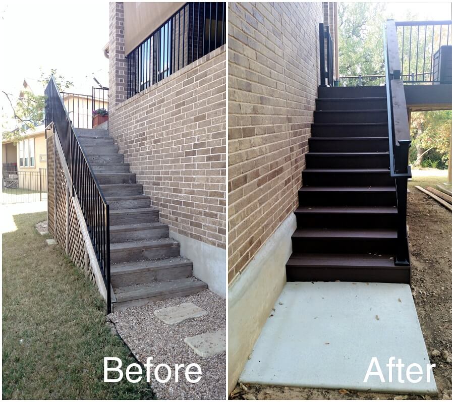 — Before and After: AZEK low-maintenance stairs now lead safely to a level landing pad.