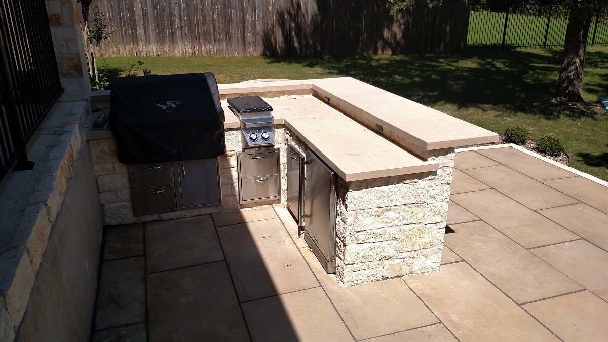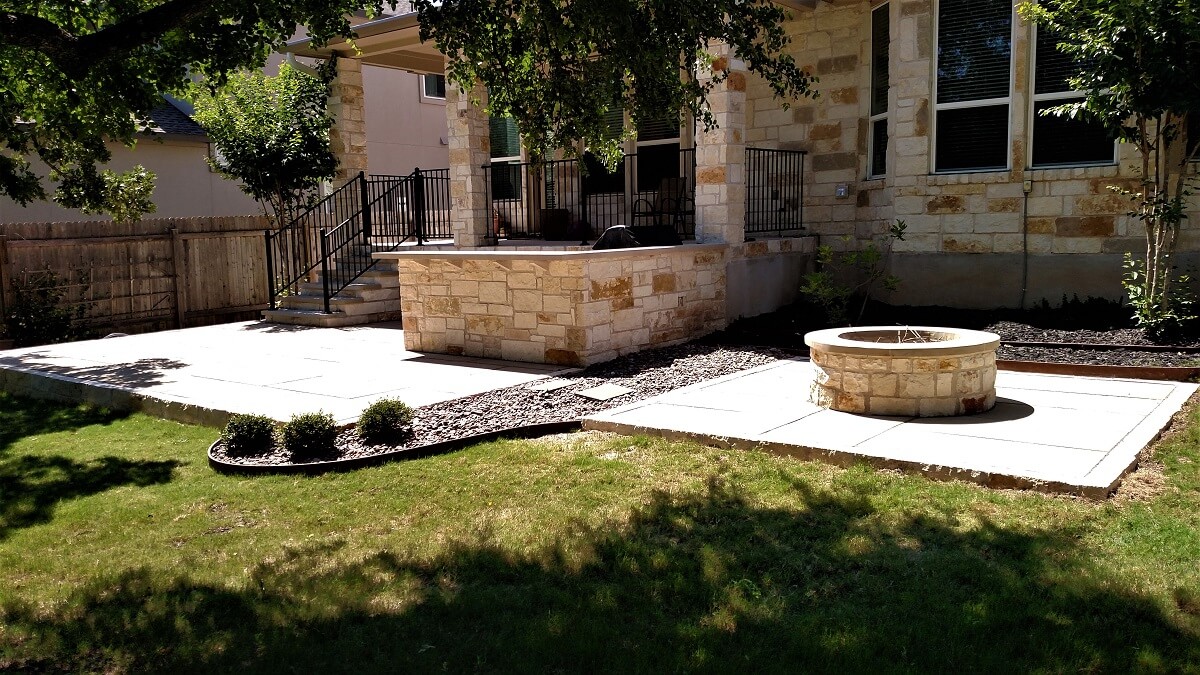 Archadeck of Austin came up with a winning design including a stone retaining wall, patio, outdoor kitchen, and fire pit. All the dimensions had to be carefully calculated so we didn’t go over the allowed percentage of impervious space. We built the stone retaining wall on a concrete footer, built the stone walls for the outdoor kitchen, then filled in the patio area with sand. Sand is perfect for a project like this because it’s permeable and it packs nicely while water still filters through it.