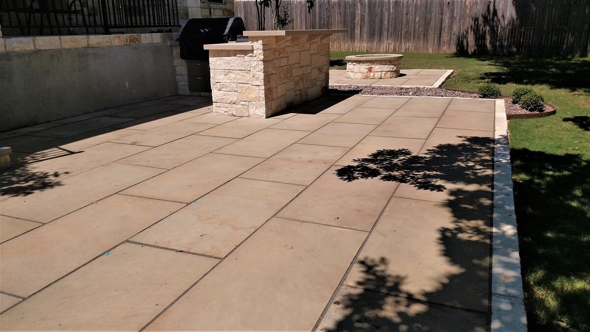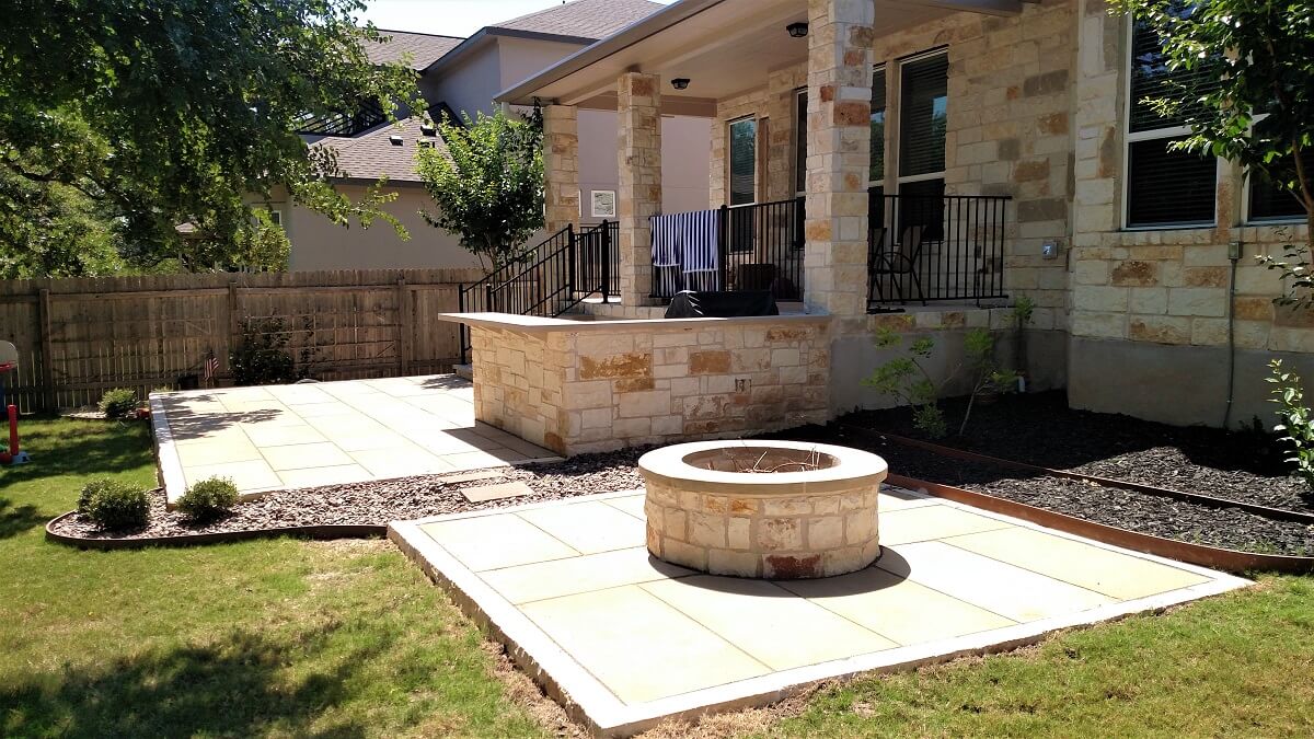 - We used the same durable, low-maintenance Lueders stone for the top surface of the fire pit, the counters of the outdoor kitchen, and the steps leading from patio to porch.