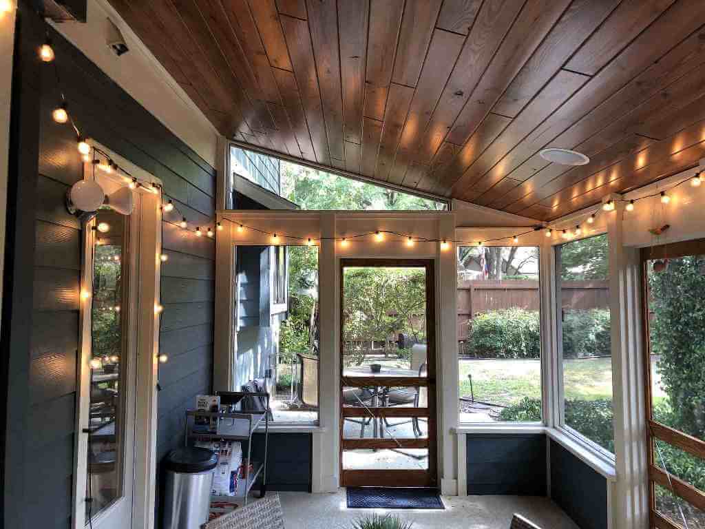 The first thing these homeowners did after we completed their screened porch was hang festive string lighting around the interior. Pure joy is what we see there. And those little lights help show off the beautiful porch ceiling. Here we installed our trademark tongue-and-groove ceiling made by Synergy Wood. These Synergy Wood ceilings are always gorgeous. They’re made of premium-quality wood, hand-crafted and prefinished, and our clients love them. We added a ceiling fan and recessed lighting to the ceiling to bring indoor comfort outdoors.
