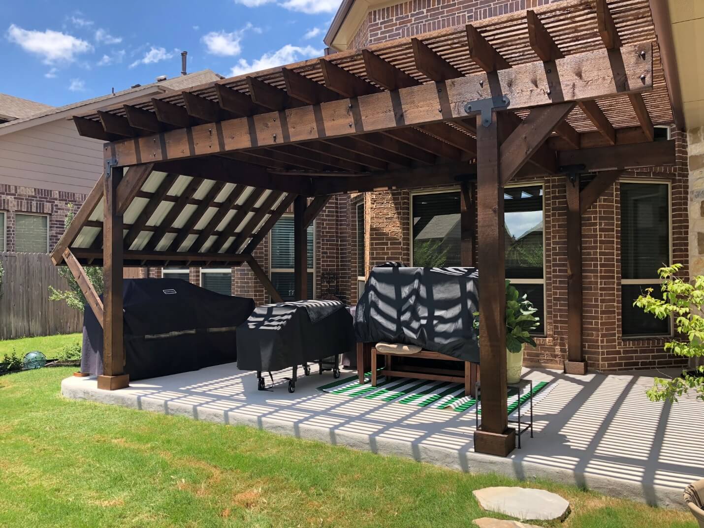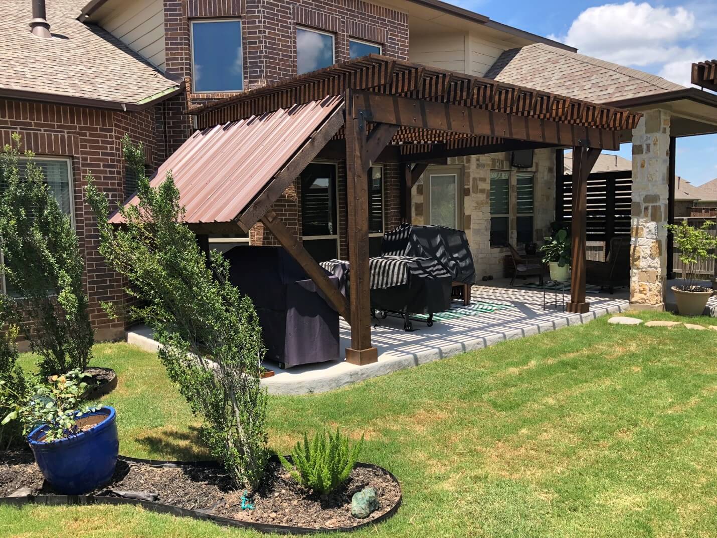 These Liberty Hill homeowners had one very distinct issue with outdoor food prep. Facing due west, their grill space on the patio was subject to the hottest sunlight of the entire day. To resolve the issue, we added on a custom shade roof, built specifically for evening grilling! This angled metal roof will keep the elements at bay, so the grill master can attend to his or her duties in complete comfort.