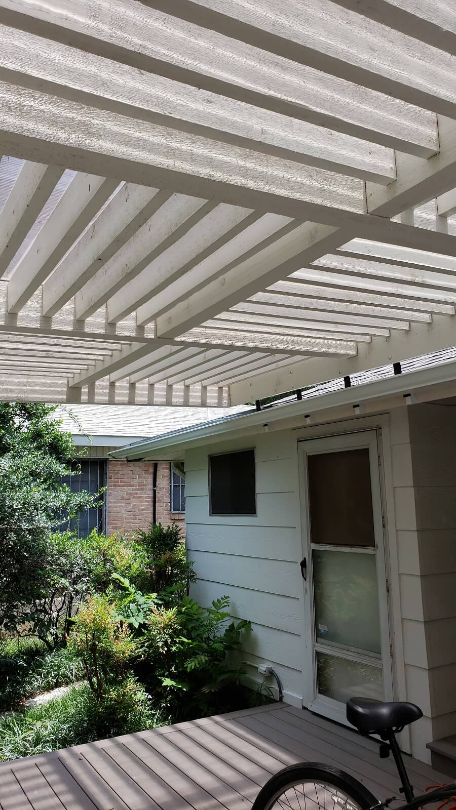 The two most challenging requirements were that the pergola had to be attached to the house and it had to extend over half the deck. Not over the whole deck, just over half of it.