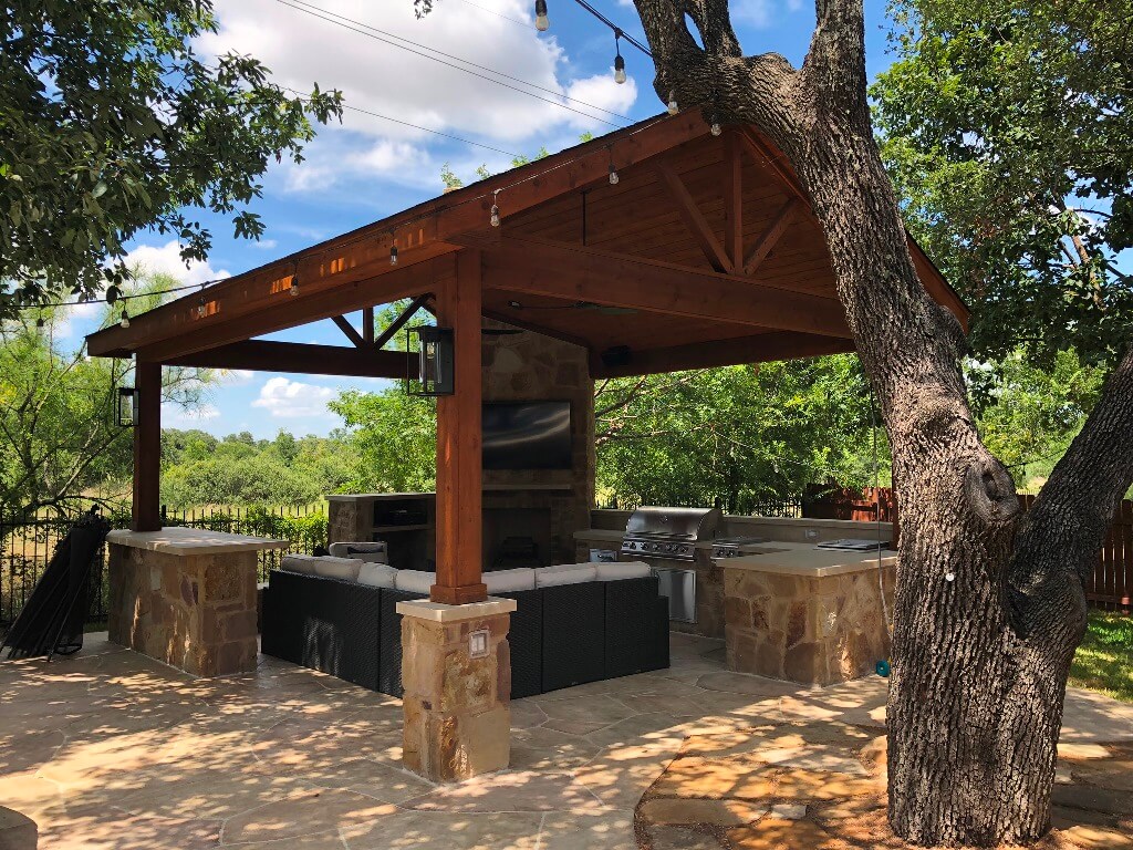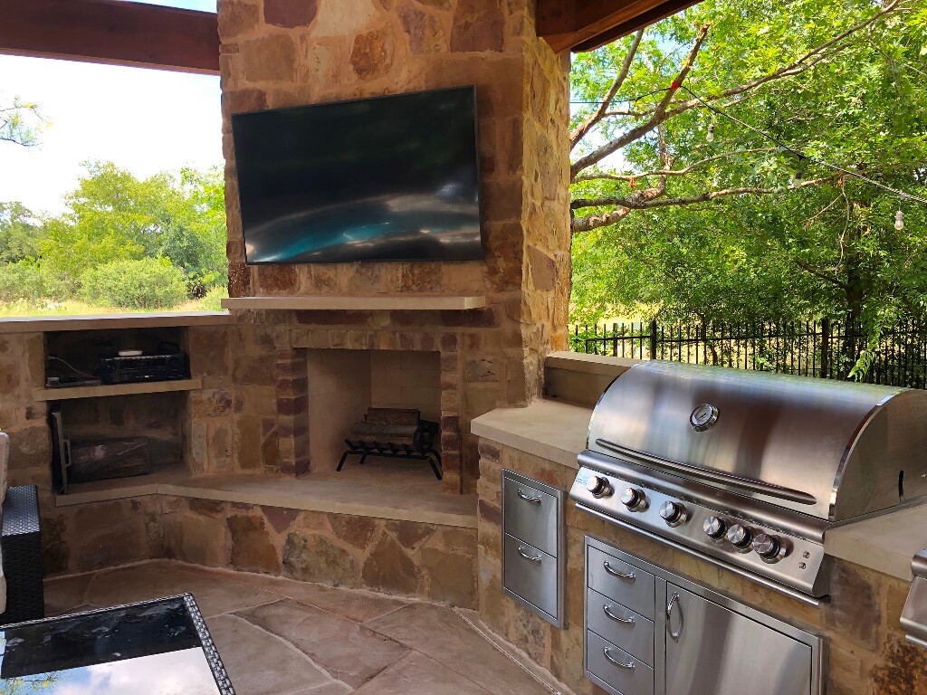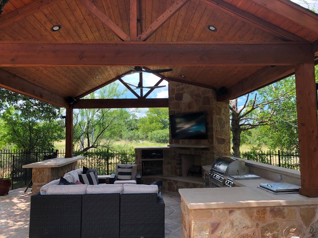 —Wood-burning outdoor fireplace under Round Rock TX covered patio by Archadeck of Austin