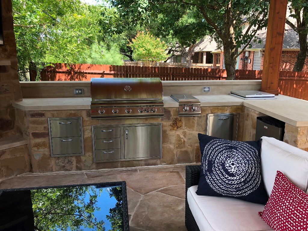 That’s right! As many Archadeck of Austin clients know, outdoor living means that you bring interior amenities outdoors – and much of the time, that includes kitchen accoutrements! This outdoor kitchen is chock full of useful amenities. It offers a grill, side burner, utility and storage drawers, a cooler, and a refrigerator.