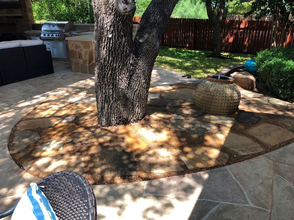 Customization didn’t stop underneath this patio cover! Just outside the cabana’s confines, we created a surround for one of the mature trees in this back yard, which will preserve its health. Instead of concrete, which would have killed the tree, we laid flagstone surrounded by decomposed granite.