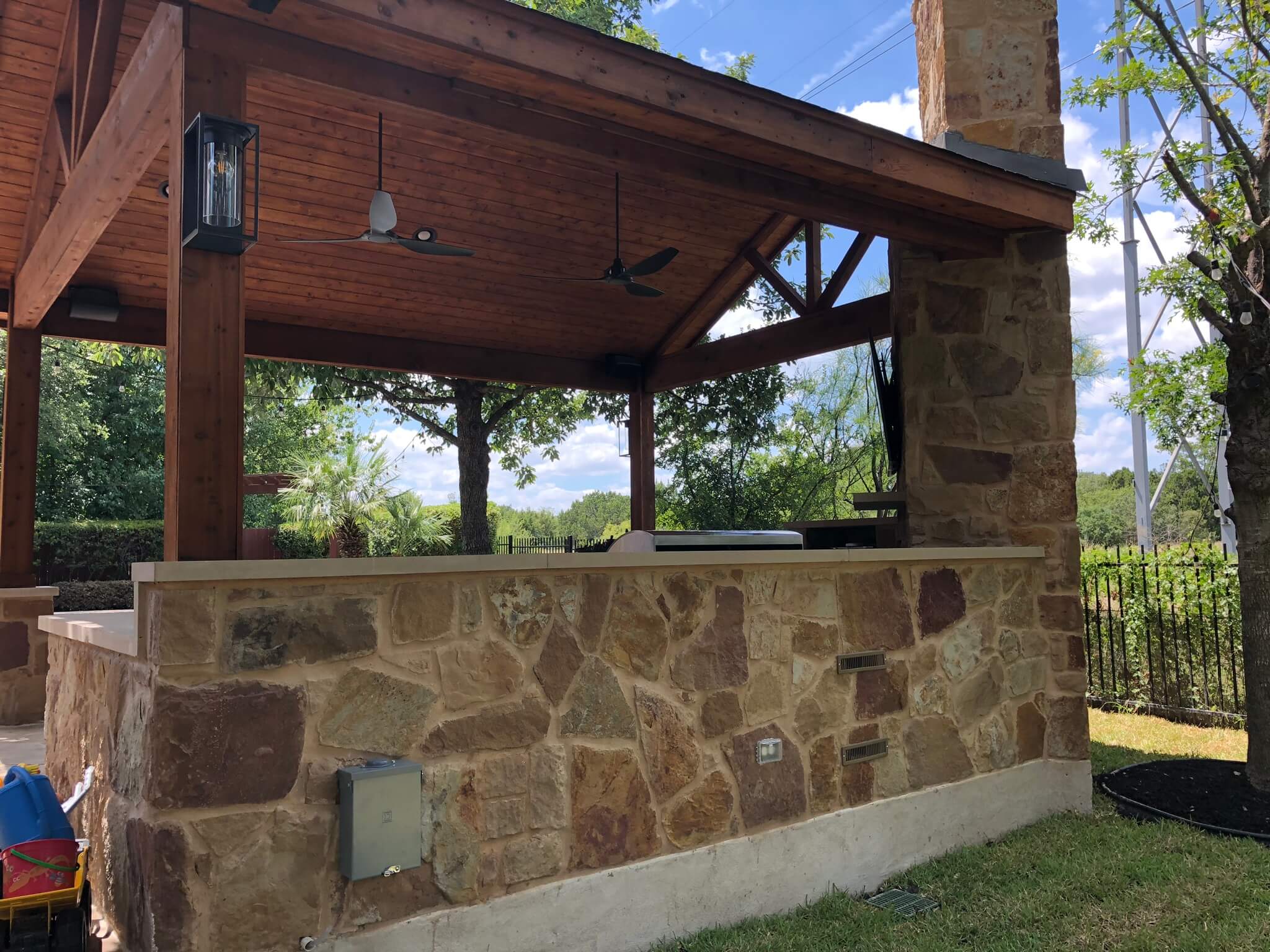 This poolside cabana is first and foremost a shining example of a well-thought-out and executed Archadeck outdoor living design. The freestanding 17’x19’ patio cover is supported by cedar and stone-wrapped columns for a thoroughly rustic aesthetic. The high gable roof with open rafters achieves ultimate light entry inside this shady respite, and boasts beautiful cedar-wrapped gable trim for a truly tailored look.
