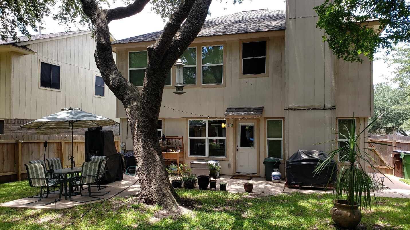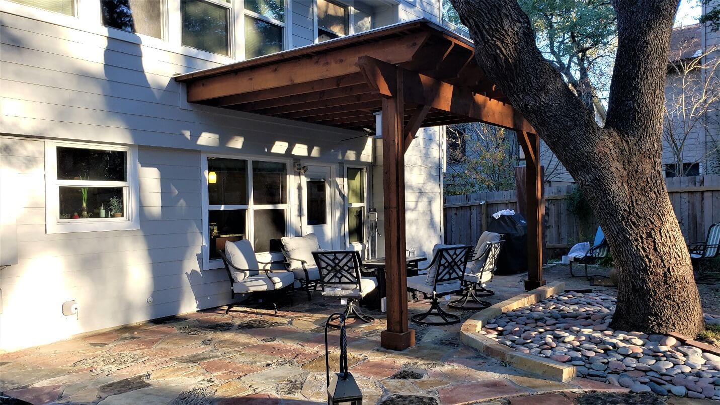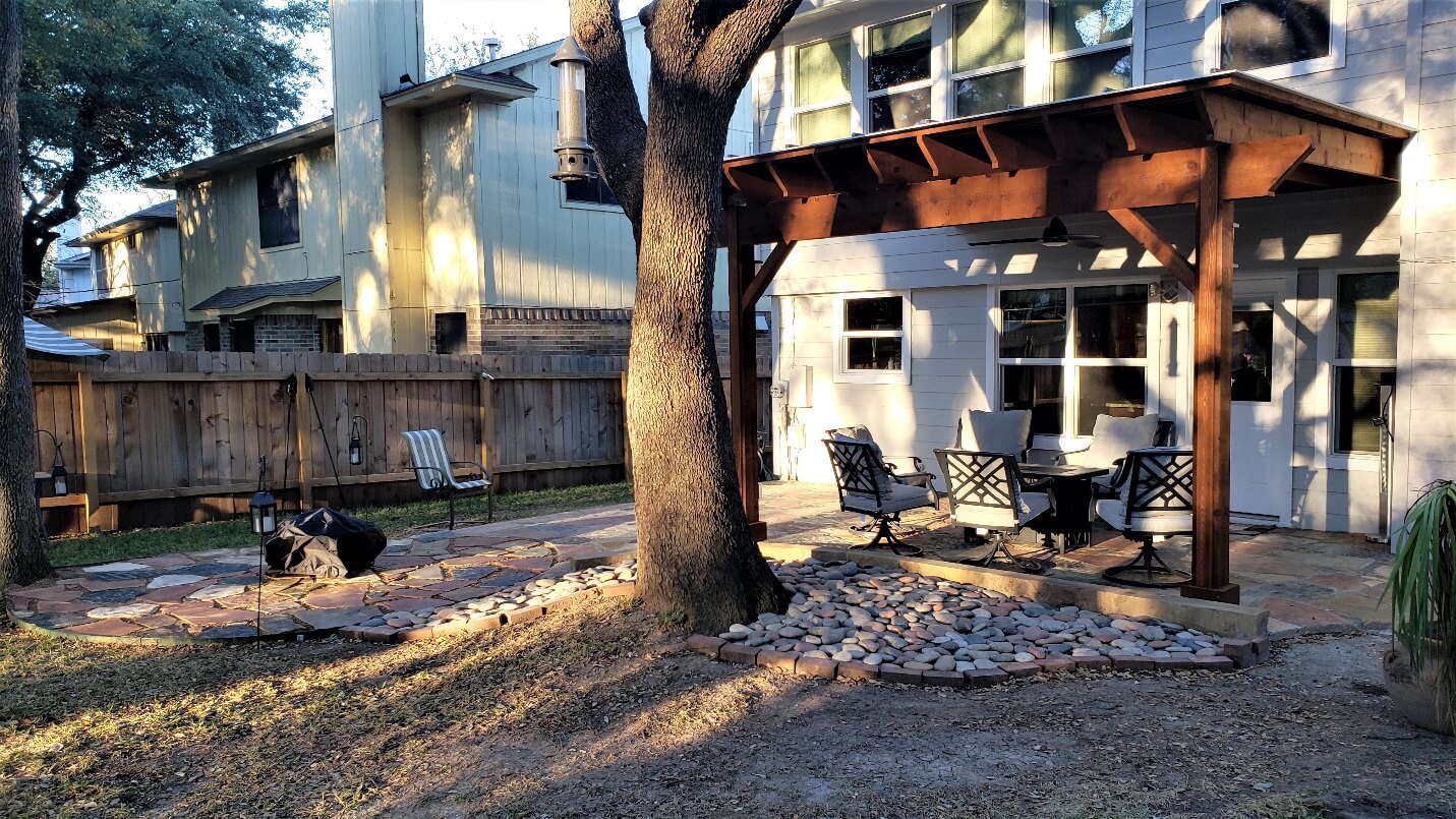 — Beautifully-shaded sitting area under NW Austin cedar pergola.