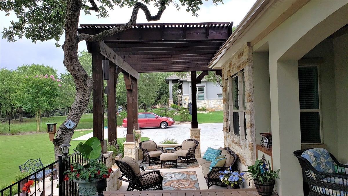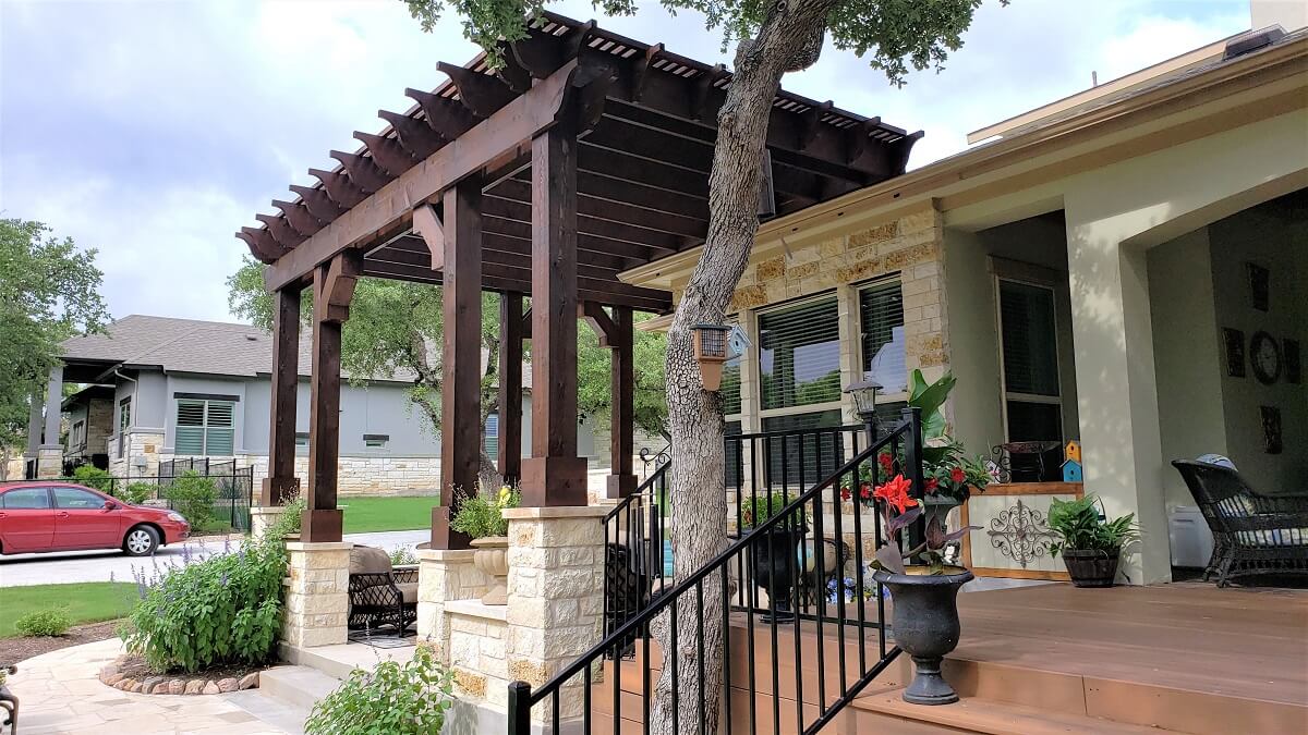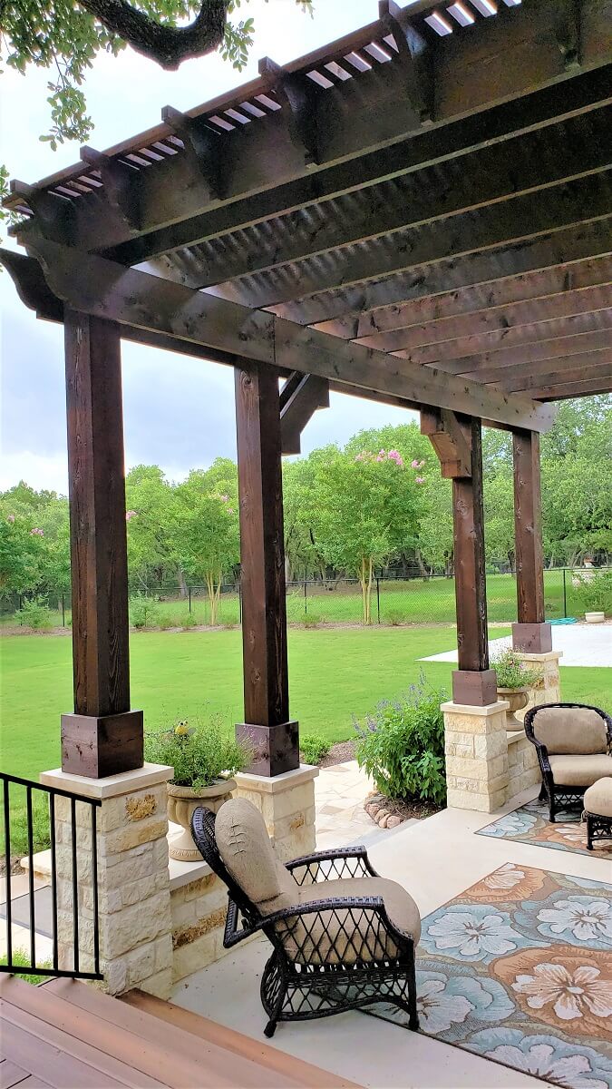 It’s true that a pergola won’t provide complete shade without an additional covering. We described a completely covered pergola recently in our post, Round Rock Texas Pergola Backyard Oasis. We do have ways to increase the amount of shade a pergola provides, however, without adding a cover. For this new Georgetown, TX, pergola project, we placed the slats at the top of the pergola very close together for additional shade.