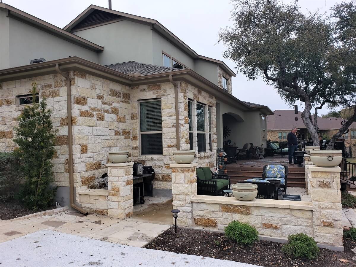 There’s a secret hidden within the design of this patio. If you know what to look for, you can see it lurking mysteriously in the “Before” photo. Archadeck of Austin did not build this patio, so we can’t take credit for that. At first glance, this walled patio looks complete. The low patio wall could serve as a seating wall if the homeowners need additional seating. The wall is punctuated with six stone pillars that flank openings from the patio to the yard. It’s topped off, or capped, with smooth Lueders limestone – as is each of the stone columns.
