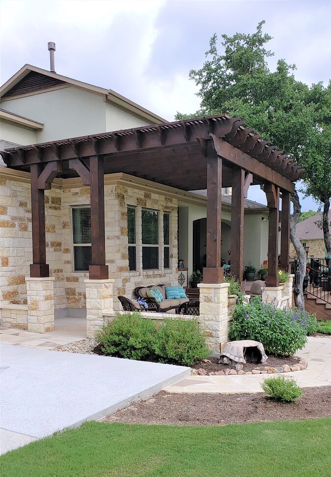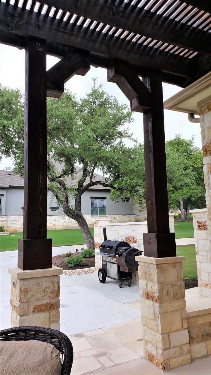 The stone pillars in the patio wall were designed to become columns supporting the weight of a pergola. These columns were filled with concrete before Archadeck of Austin arrived to add the pergola. With this level of support already in place, we were able to mount the pergola’s posts right on top of the Lueders stone caps on the existing columns.