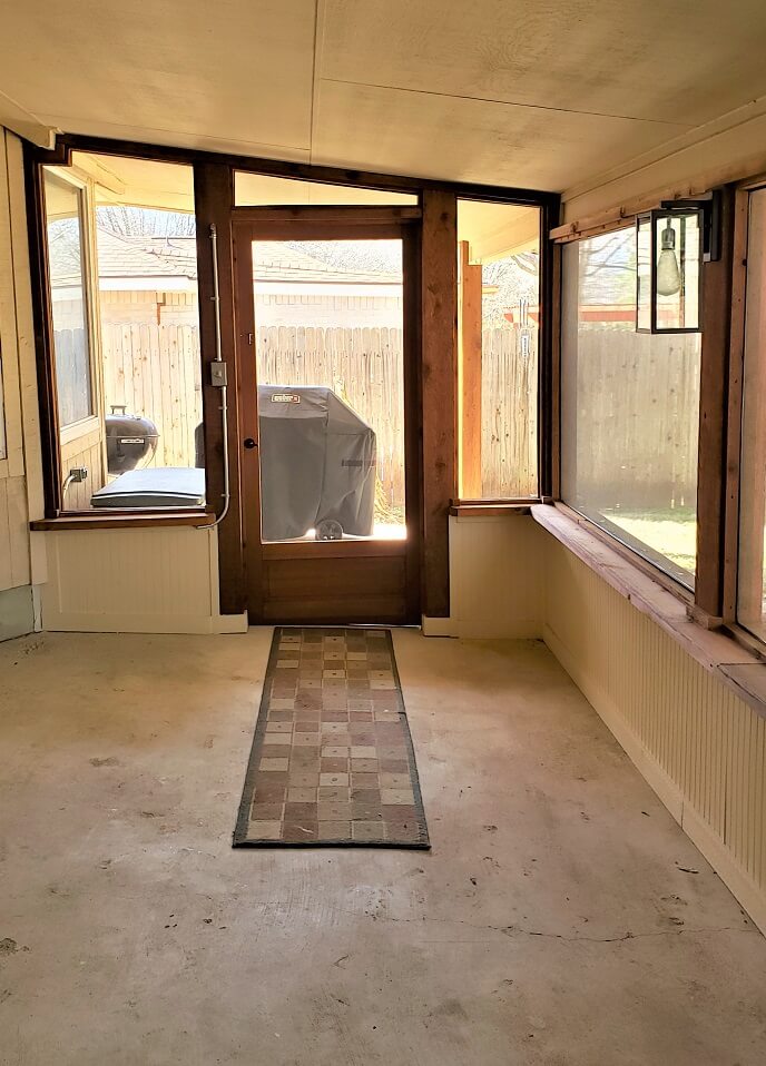 Not a doggie door, but a “hose door” — Yes, you read that right! The outdoor water spigot is located inside the porch area, so we custom built a small door for the garden hose. Now the homeowner doesn’t have to prop the screen door open to access the hose from the outside. Creative design!