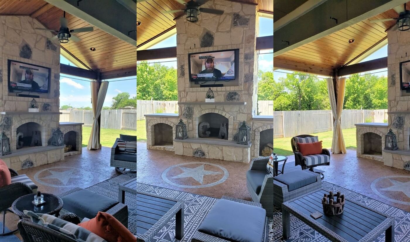 In this project, we enlarged the homeowners’ patio, added an outdoor fireplace and built a new roof over the patio extension. We applied a custom concrete overlay to the floor throughout to bring the existing and new sections of the patio together as one big outdoor room. The fireplace is beautiful with white and nicotine limestone, and we integrated the Star of Texas into the floor’s concrete overlay in front of the hearth. Do you love it?