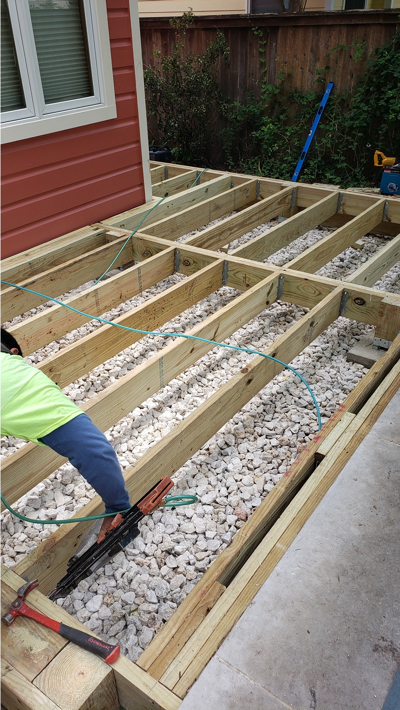 For the substructure, we laid a bed of gravel for proper drainage so the lumber won’t sit in water. Rock underneath the structure will allow those boards to dry out. We also applied wood guard to the wood here for increased durability and to ward off decay, fungi, mold and termites.