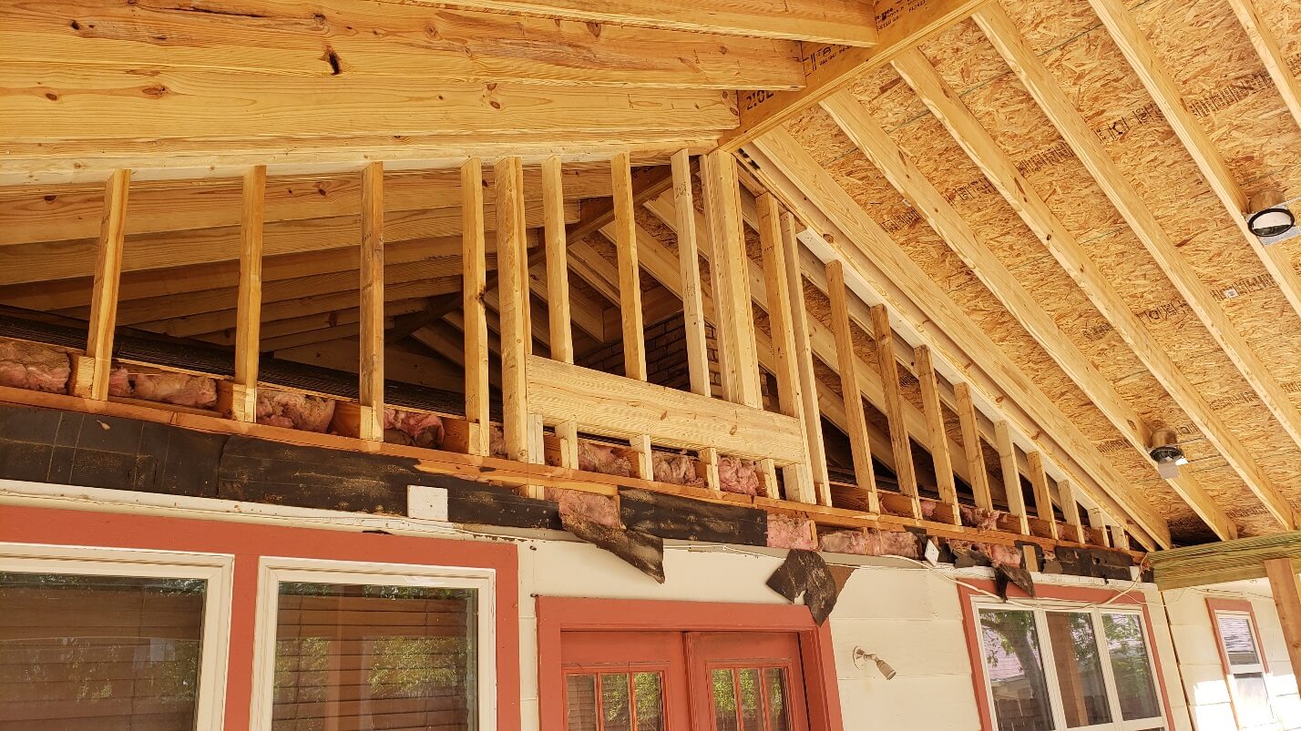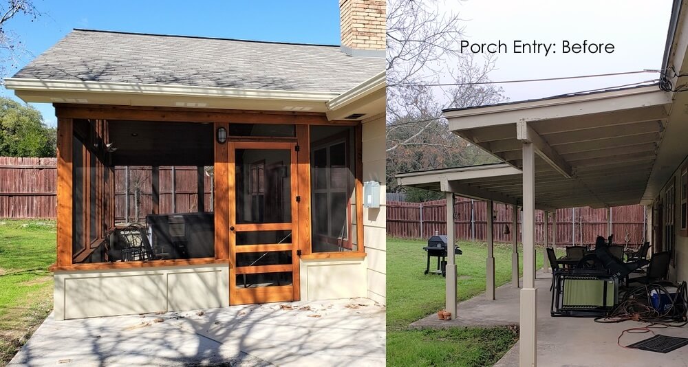 These South Austin clients had a rolled roof porch structure built onto the back of their home, extending from their soffit. Their biggest complaint was that the interior of their home was shrouded in darkness due to the shade provided by the porch roof, which covered every window and door on the back of their home. Aside from the shady nature of the roof, it was so low, this family and their guests could hit their heads entering or exiting the covered area.