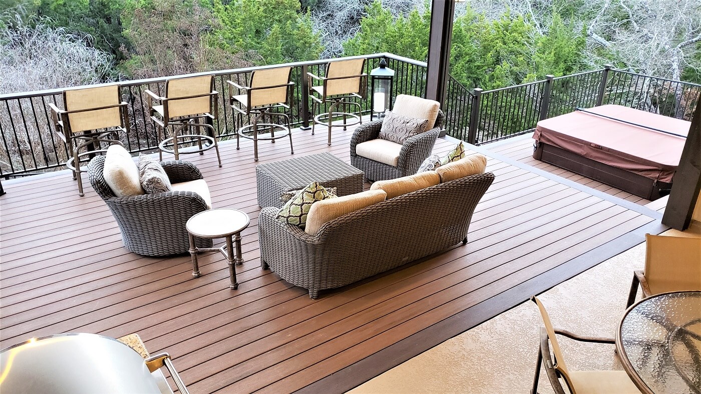 These Leander clients were looking for a big deck upgrade in a tight space. They longed for better usability of their outdoor living area by way of a dual-level, low-maintenance deck. On each level, they wished for particular accommodations and usage. A gathering area on the upper level and a hot tub on the lower. The result is a tidy Leander TX deck with room to move!