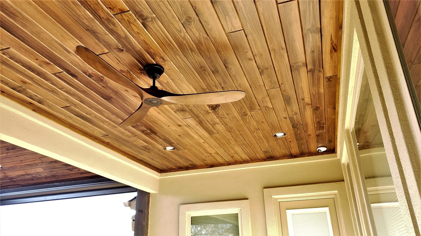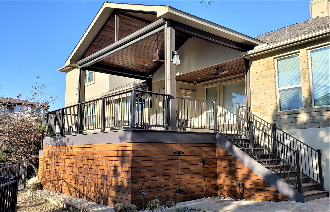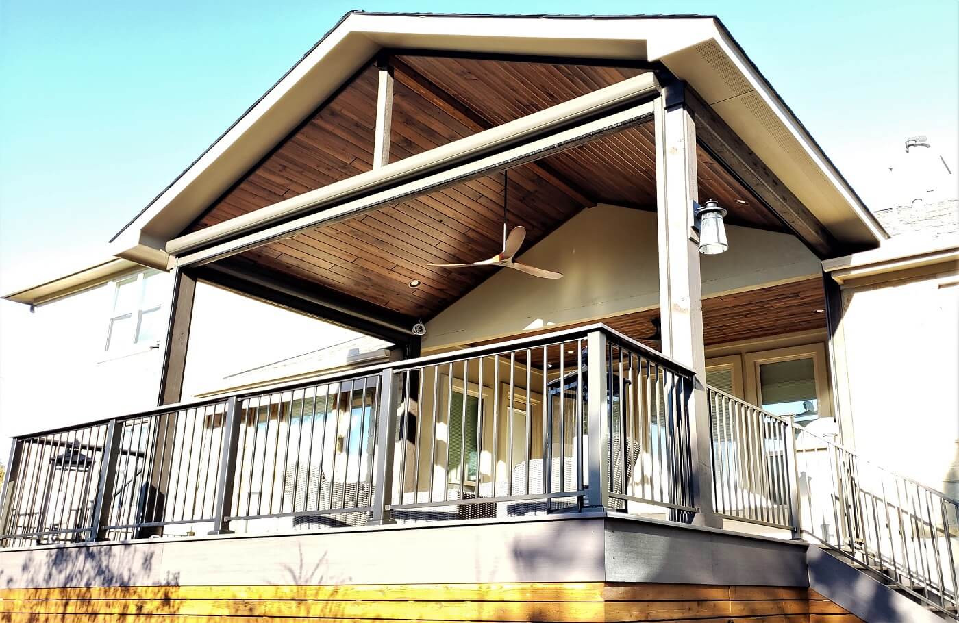 Archadeck of Austin designed and built a large cathedral roof over the upper deck, just outside the existing covered porch area of the home. We resurfaced the existing porch roof to match the new deck roof using Synergywood® ceiling in Colonial finish. The open gable design is perfect for maximum light entry under the protection of this stunning roof.