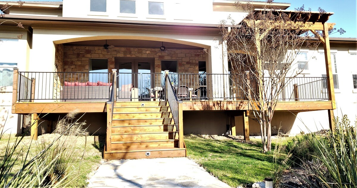 Our clients wanted to recreate the railing that was original to the patio. They chose to have powder-coated iron deck and stair railings custom fabricated for the project. Each cedar railing post is topped with an LED lighted post cap.
