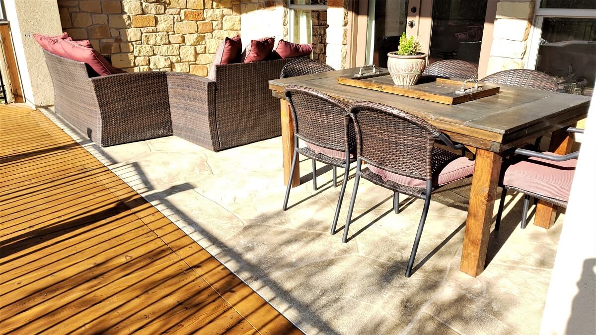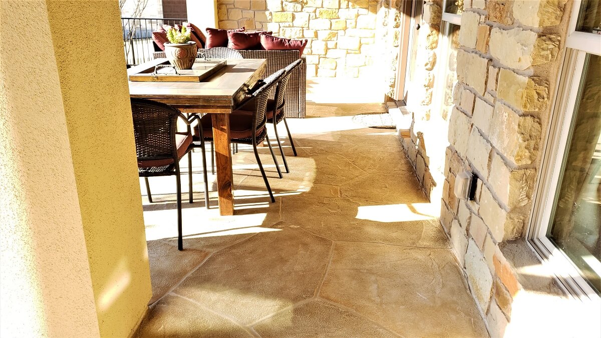 The existing salt finish patio flooring got a beautiful new overlay with a custom pattern, chosen by our clients on-site. The floor now has an attractive flagstone pattern, and neutral tones to match the existing stone and stucco on the home.