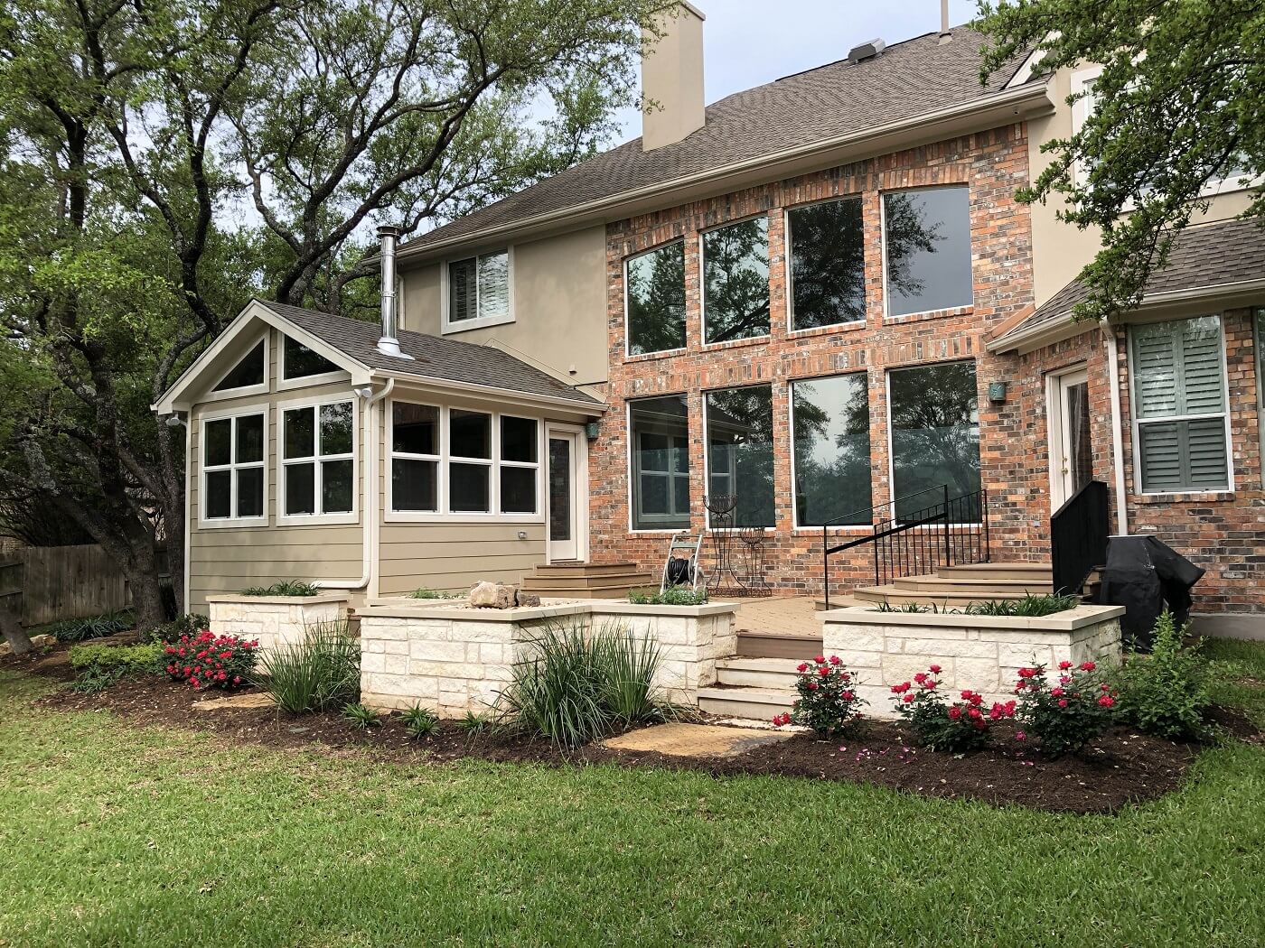 At Archadeck of Austin, we design and build many single-structure projects, but creating beautiful outdoor living combinations is what we love doing the most. The Steiner Ranch project featured here is a perfect example. Creating this cohesive outdoor living environment with a sunroom, a deck, and a series of stone planters was rewarding work! The harmony present in this space says all is right in this little corner of the world.
