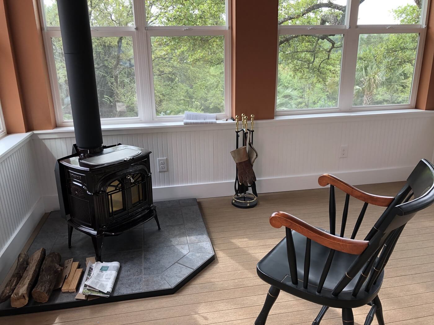 This sunroom, full of windows, full of light, accomplishes its mission: to bring the outdoors indoors. Instead of tying into the home’s HVAC system, the sunroom is climate-controlled by a single split ductless heating and cooling system. Year-round, the homeowners can enjoy the view from this peaceful room, always comfortable here regardless of the temperature outdoors. The sunroom is just off the husband’s study and features a charming wood-burning stove, which the homeowners installed.