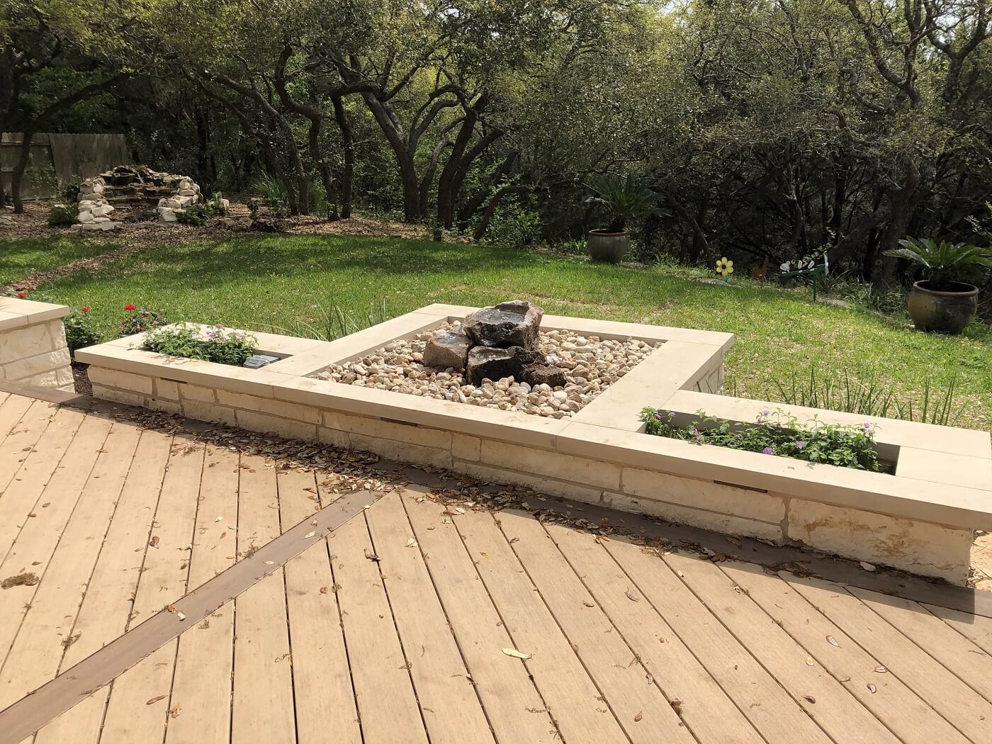 Much of the charm of this sunroom-and-deck combination comes from the custom stone planters that border the deck. We used white limestone chopped stone for the outside of the planters and Lueders stone caps along the tops. White stone steps descend between the planters, into the back yard. At the center of the stone planters is a fountain. Archadeck of Austin prepared the masonry for this water feature, and Hill Country Gardens installed it.