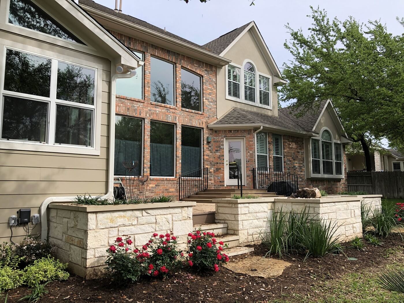 The work we did here fits in so well with this Steiner Ranch home, it’s hard to believe the sunroom, deck, and hardscapes are new on the scene. In the “before” photo, the original patio looked fine—somewhat plain, maybe, but fine. Now, after seeing its replacement, we see that patio was a blank space yearning to be filled with something exquisite.