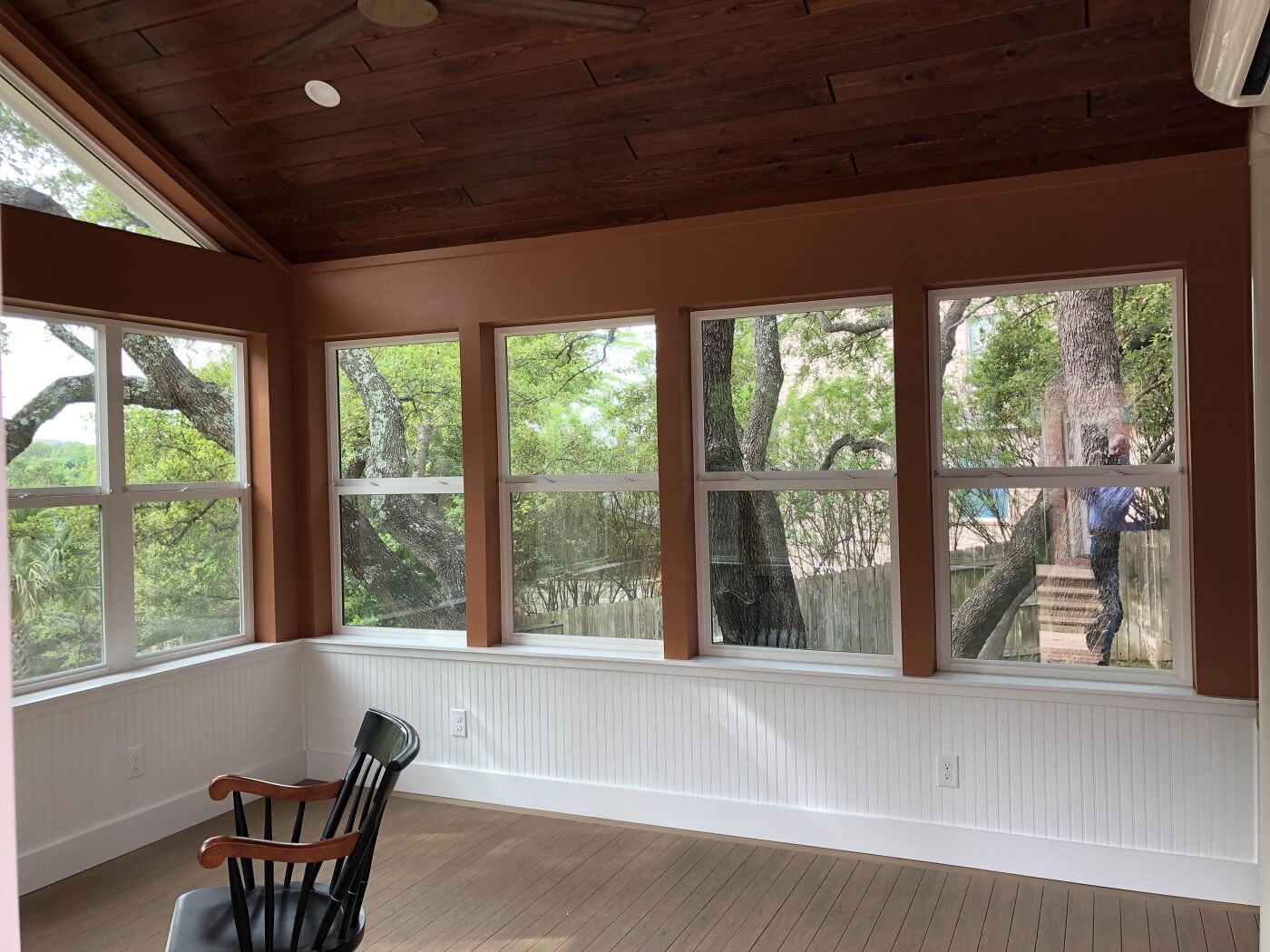 For the sunroom flooring, the clients chose AZEK porch flooring. The energy-efficient windows and doors are all from Milgard, and we built the beautiful ceiling with Synergywood, our favorite. Notice the recessed lighting in the ceiling, and the ceiling fan that blends with the ceiling itself!