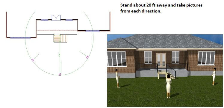 - Anyone can take the pictures needed from a cell phone. Stand about 20 ft away and take 3 pictures from different perspectives.