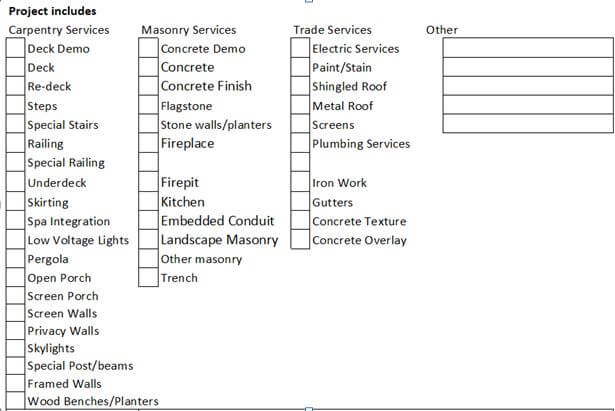 Below is a list of the different kinds of projects we do. Check off which ones you want for use in the discussion with your design consultant.
