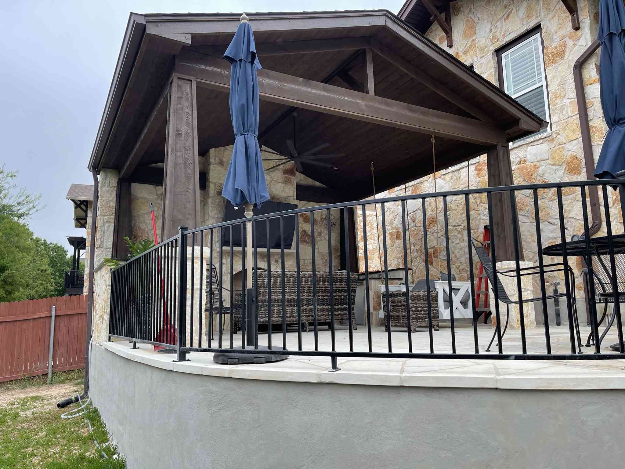 The homeowner is ecstatic with this new poolside pavilion. It fulfills her wishes for a place to hang a swing, drink wine and de-stress.