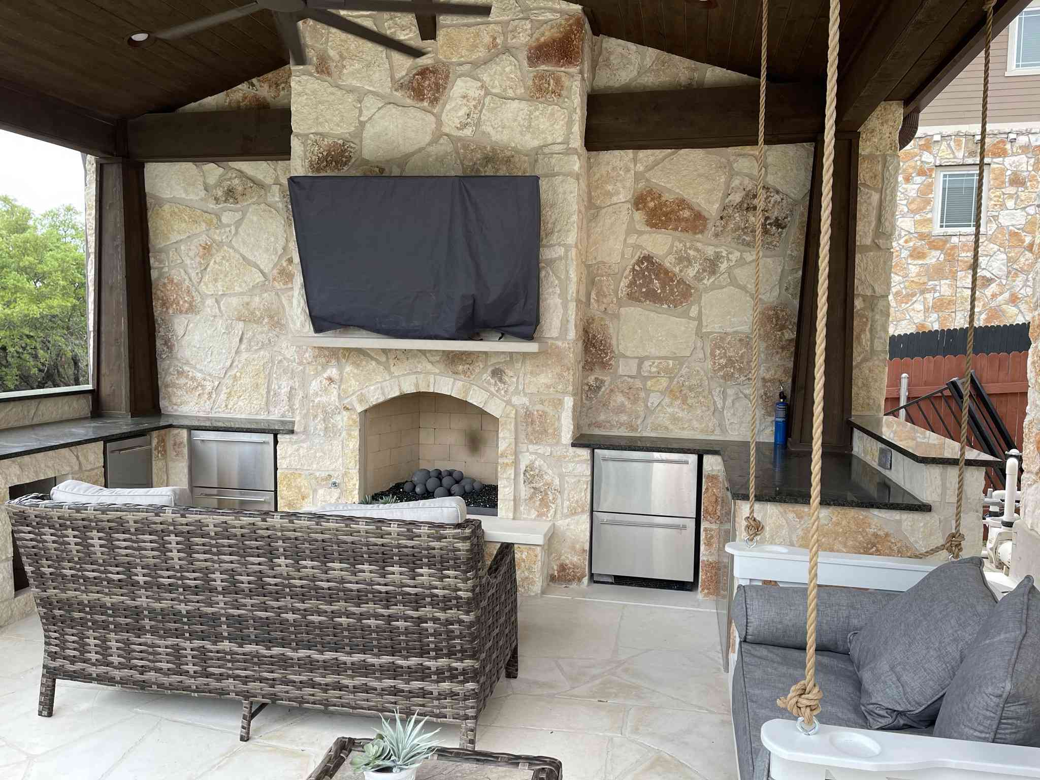Relaxing amenities? Yes, please! Our client chose a gas-burning outdoor fireplace and outdoor kitchen under the patio cover. To use the space most effectively, we designed the outdoor kitchen in two sections that flank the fireplace. The homeowner selected granite countertops in a dark shade that contrasts the limestone kitchen surround and blends well with the structure’s dark columns and trim. In addition to plenty of counterspace, the kitchen area features dual fridges, a wine cooler and an ice maker. All of this is just steps away from a comfy couch and an amazing swing – just what the doctor ordered!