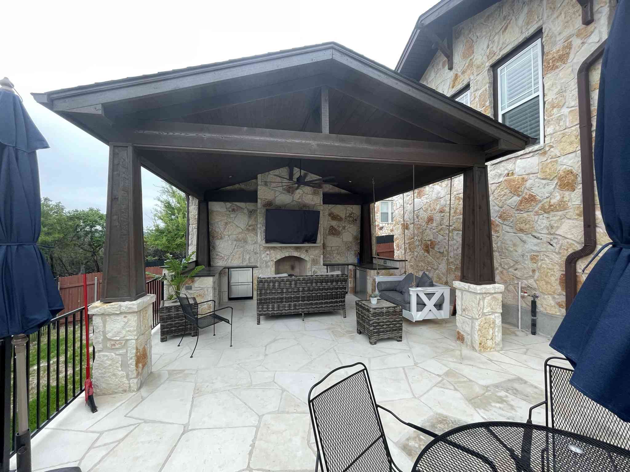 The structure we’re referring to as a freestanding poolside pavilion is also called a freestanding covered patio. (While you can’t quite see the pool in these photos, you’ll have to trust us that it’s just outside the frame.) The new patio roof provides shade for a large portion of the patio, and there is plenty of patio area still open to the stars at night. This poolside pavilion includes an outdoor fireplace and outdoor kitchen. The patio floor is flagstone.