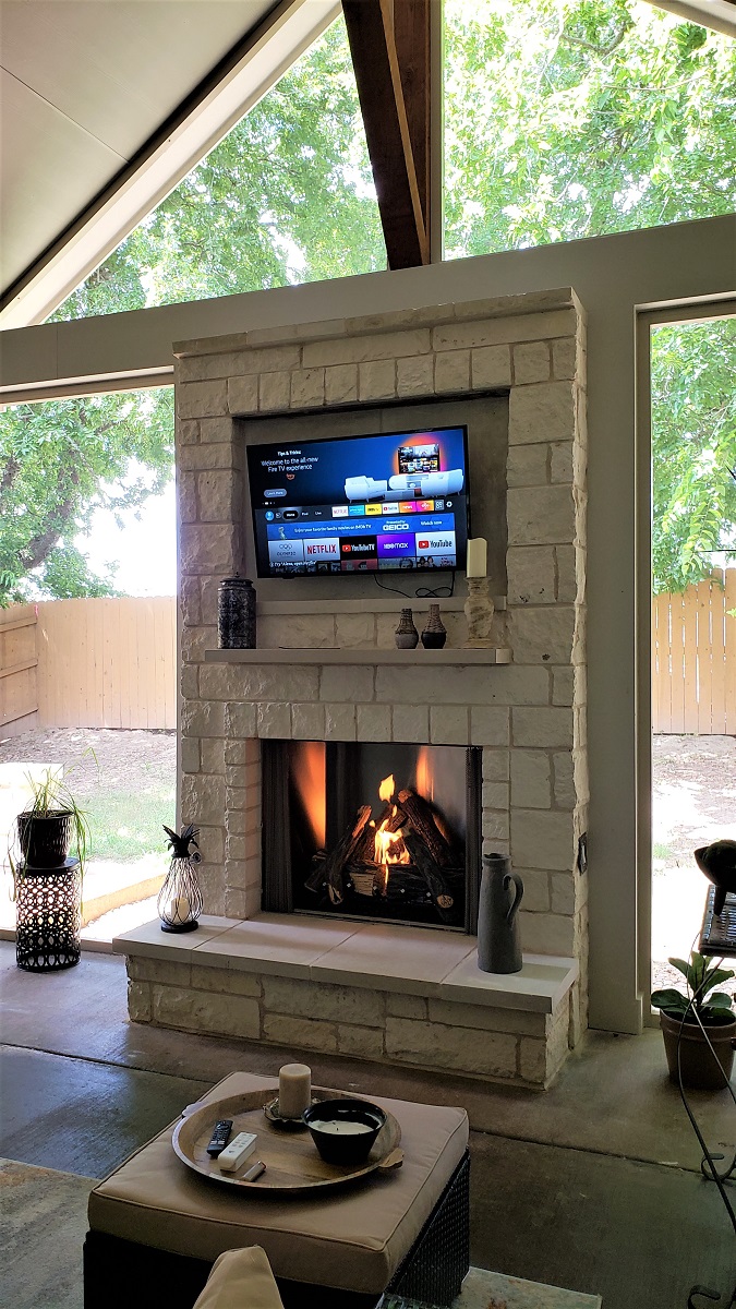 To complete the homeowner’s vision, we built this lovely chopped stone outdoor fireplace surround. We installed the fireplace the homeowner had purchased, a ventless gas system needing no flue or discharge area. For the hearth and mantel, we used Lueders limestone – smooth to the touch and beautiful as a surface in any outdoor space.
