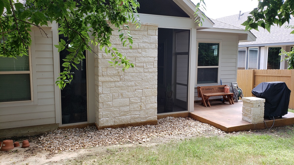 Our client wanted a larger covered porch, and an outdoor fireplace, too. She went ahead and added more concrete, about 5’ deep, to enlarge the floor space for the outdoor room she envisioned. Archadeck of Austin came in and moved the existing roof, extending it to cover the enlarged porch area. We retained the open gable design of the original roof because it lets in so much light. To make sure the new construction looked original to the home, we matched the original roof shingles, facia and soffit. We also stained the concrete surfaces, old and new, so the floor would look uniform throughout.