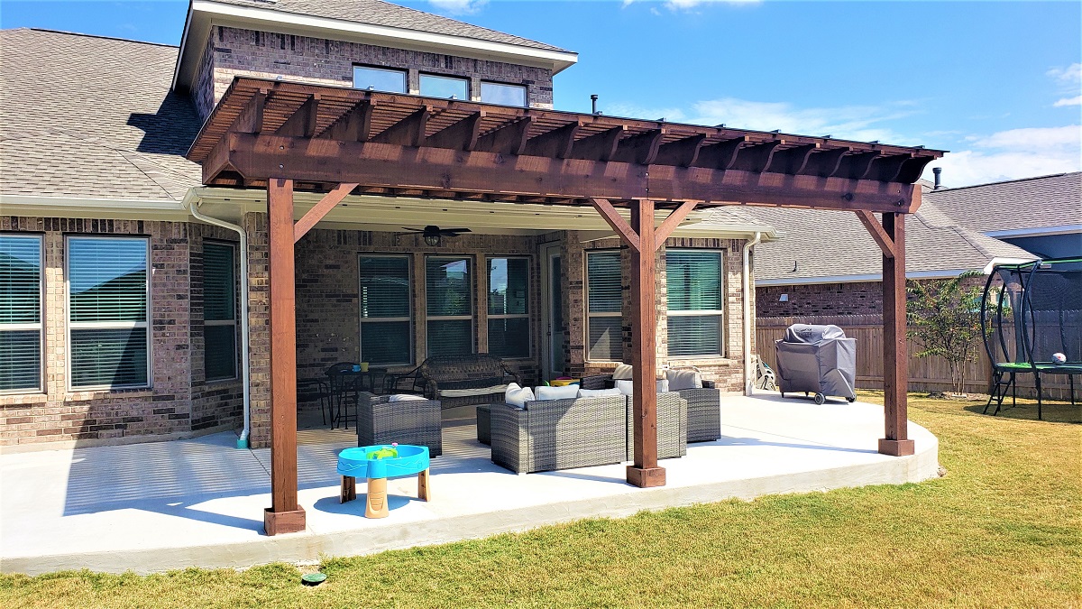 This Austin custom pergola features a thrusting design reminiscent of the entrance gates to hallowed halls.