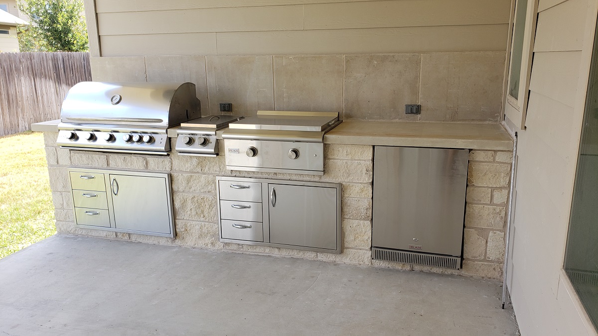 These Pflugerville, TX, homeowners had a covered patio and wanted to add an outdoor kitchen. They had just the right amount of space to add the components they wanted for preparing and enjoying meals outdoors. The center of attention here is the extra-large grill. No one is going hungry around this patio! Our clients wanted easy access to other types of cooking in their outdoor space, too. In addition to the grill, their outdoor kitchen includes a griddle and a burner unit with a cover.