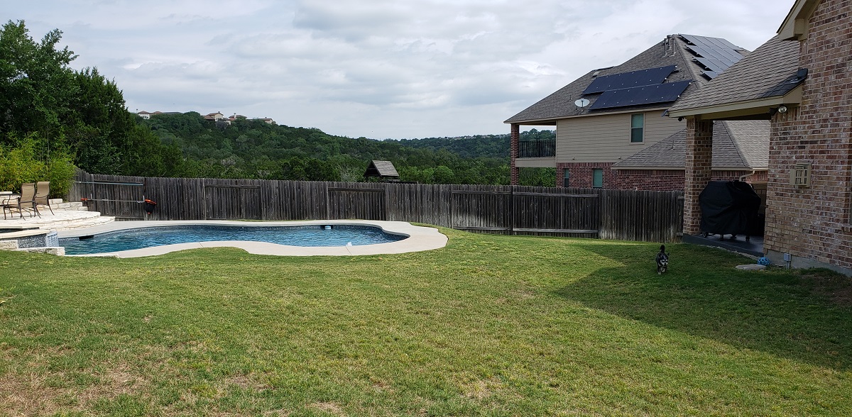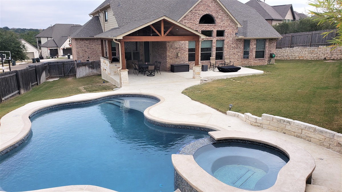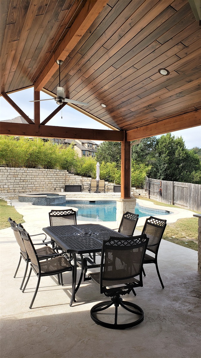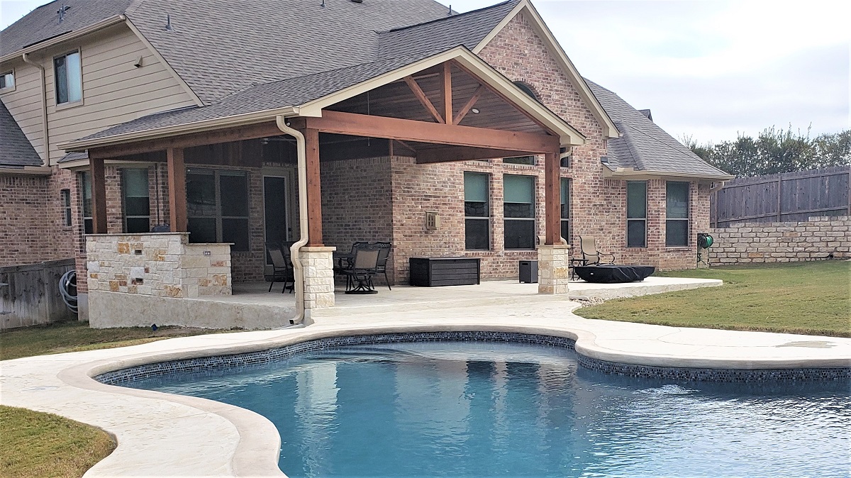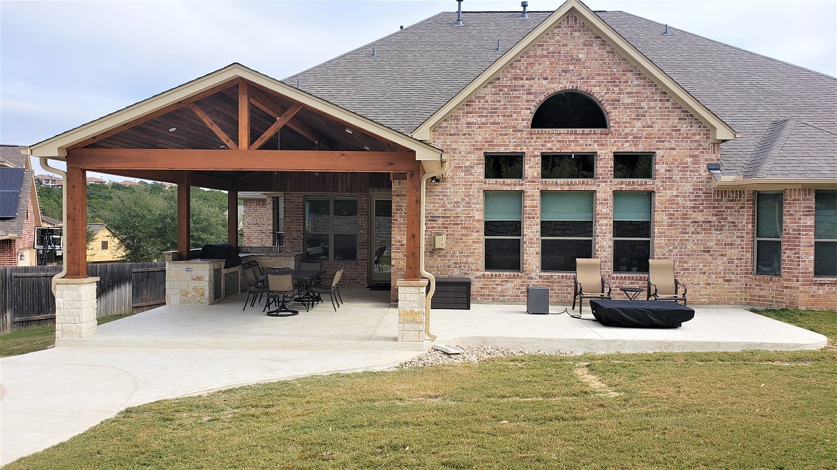 Instead of demolishing the existing concrete patio slab, we added more concrete to extend it. To unify the patio floor, we applied a no-pattern overlay to the concrete throughout. Altogether we extended the patio in three directions: out into the yard, to the side under the extended porch cover, and to the opposite side. On that opposite side, the extended patio is not covered by a roof, giving the homeowners both covered and uncovered outdoor living space. They’ll have shade whenever they want it and a patio under the stars for those Steiner Ranch evenings at home.
